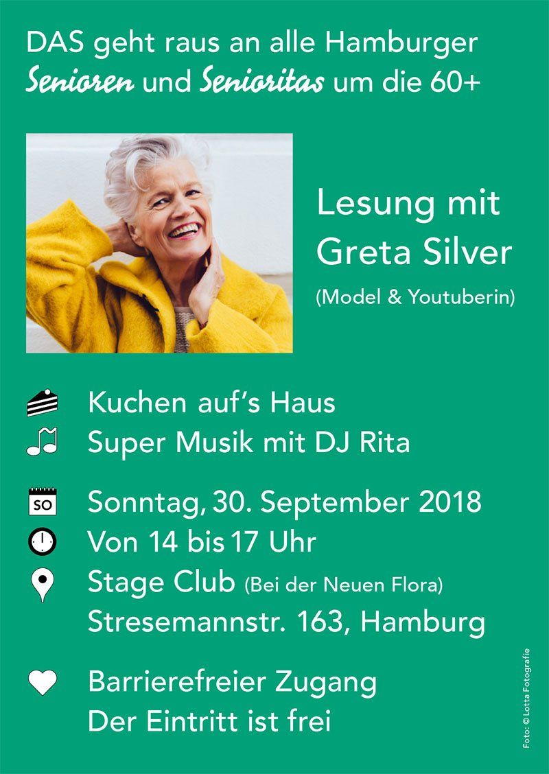 Greta Silver, begann mit knapp 50 Jahren eine neue Karriere als Inneneinrichterin und übernahm Projektverantwortung für internationale Kongresse. Mit 66 Jahren erfand sie sich noch mal neu und startete als Model und YouTuberin durch. Heute verfolgen Hundertausende täglich ihren Ratgeber-Blog „Zu jung fürs Alter“ und lassen sich von der Lebensfreude anstecken.